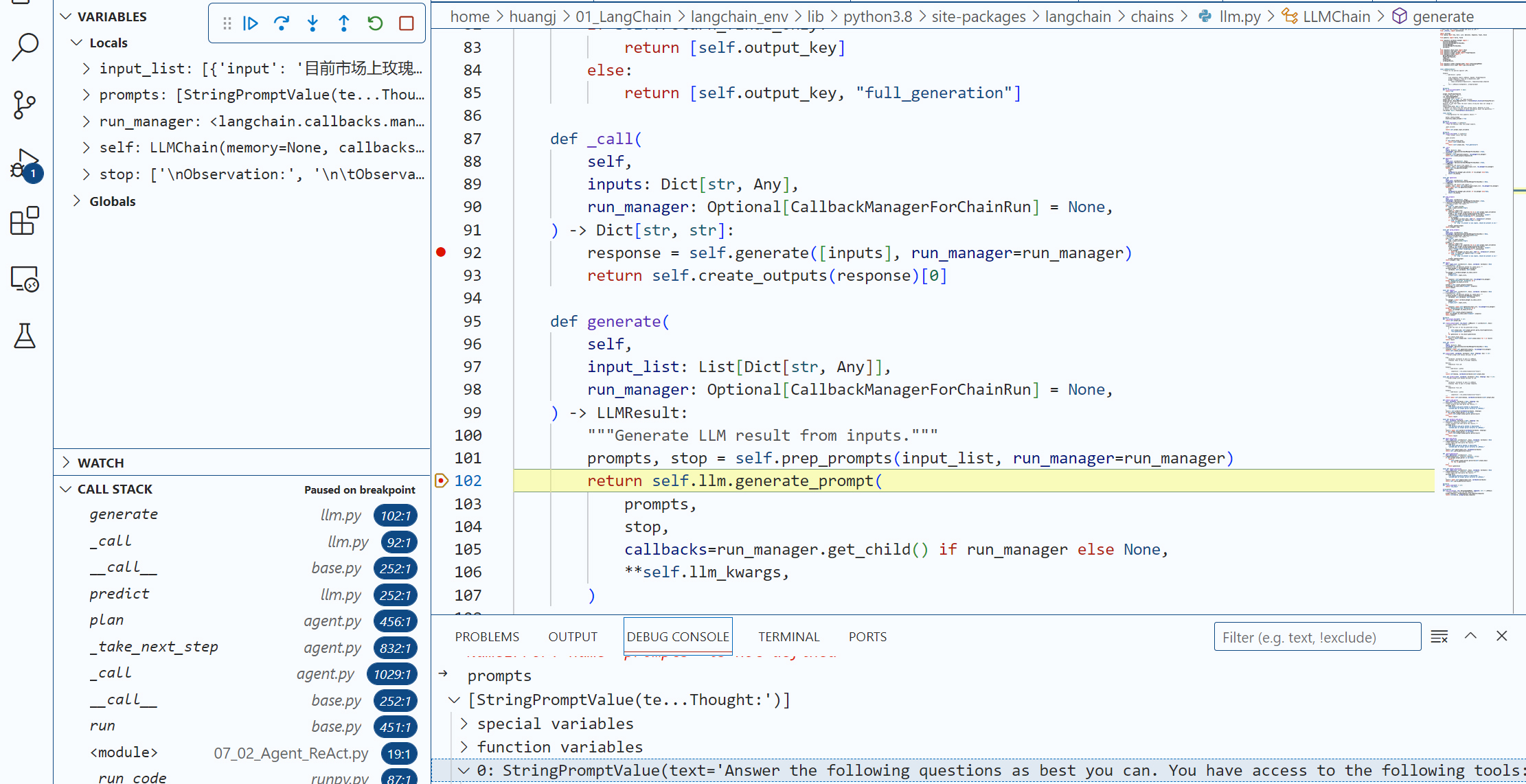 再往前进一步,我们就要开始调用大模型了,那么,LangChain到底传递给了大模型什么具体的提示信息,让大模型能够主动进行工具的选择呢?秘密在 LLMChain类的generate方法中,我们可以看到提示的具体内容。