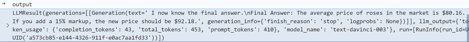 1 | 0: LLMResult(generations=[[Generation(text=' I need to find the current market price of roses and then calculate the new price with a 15% markup.\n |
