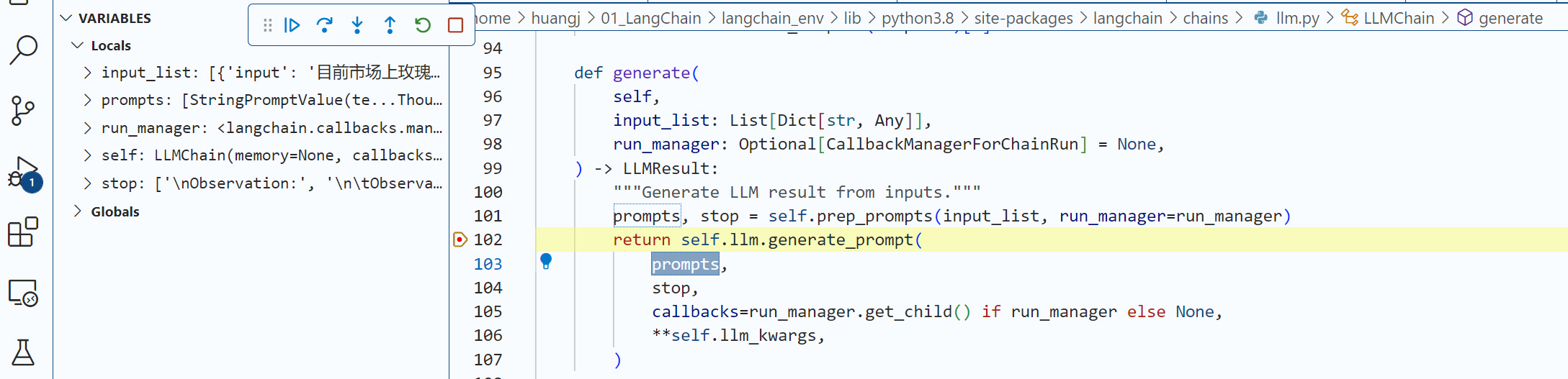 注意:如果使用VS Code,要把launch.json的justMycode项设置为false才可以debug LangChain包中的代码。