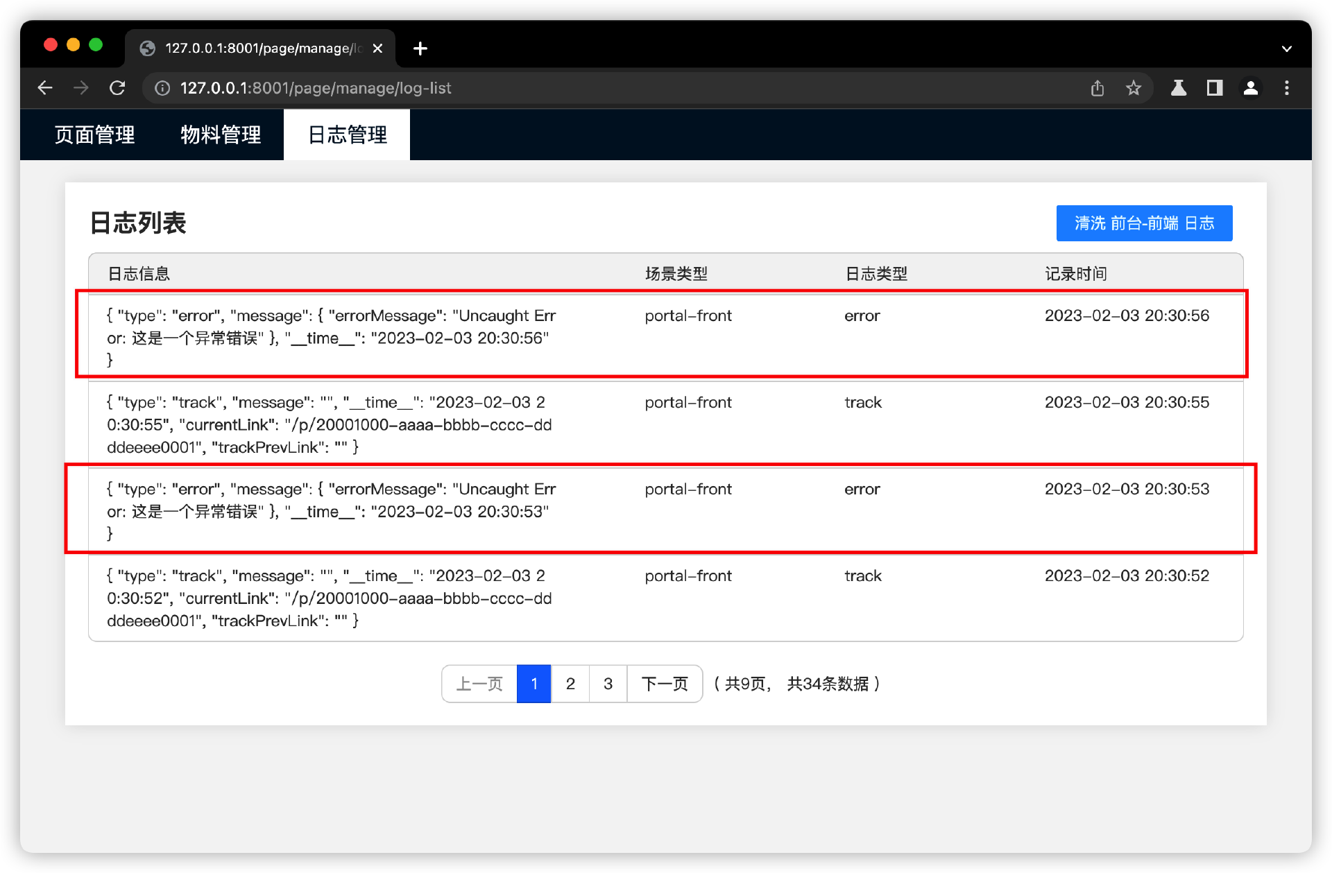 接着,在后台日志管理界面清洗日志,然后查询数据库的永久日志数据,看看近期页面有哪些前端页面报错日志。