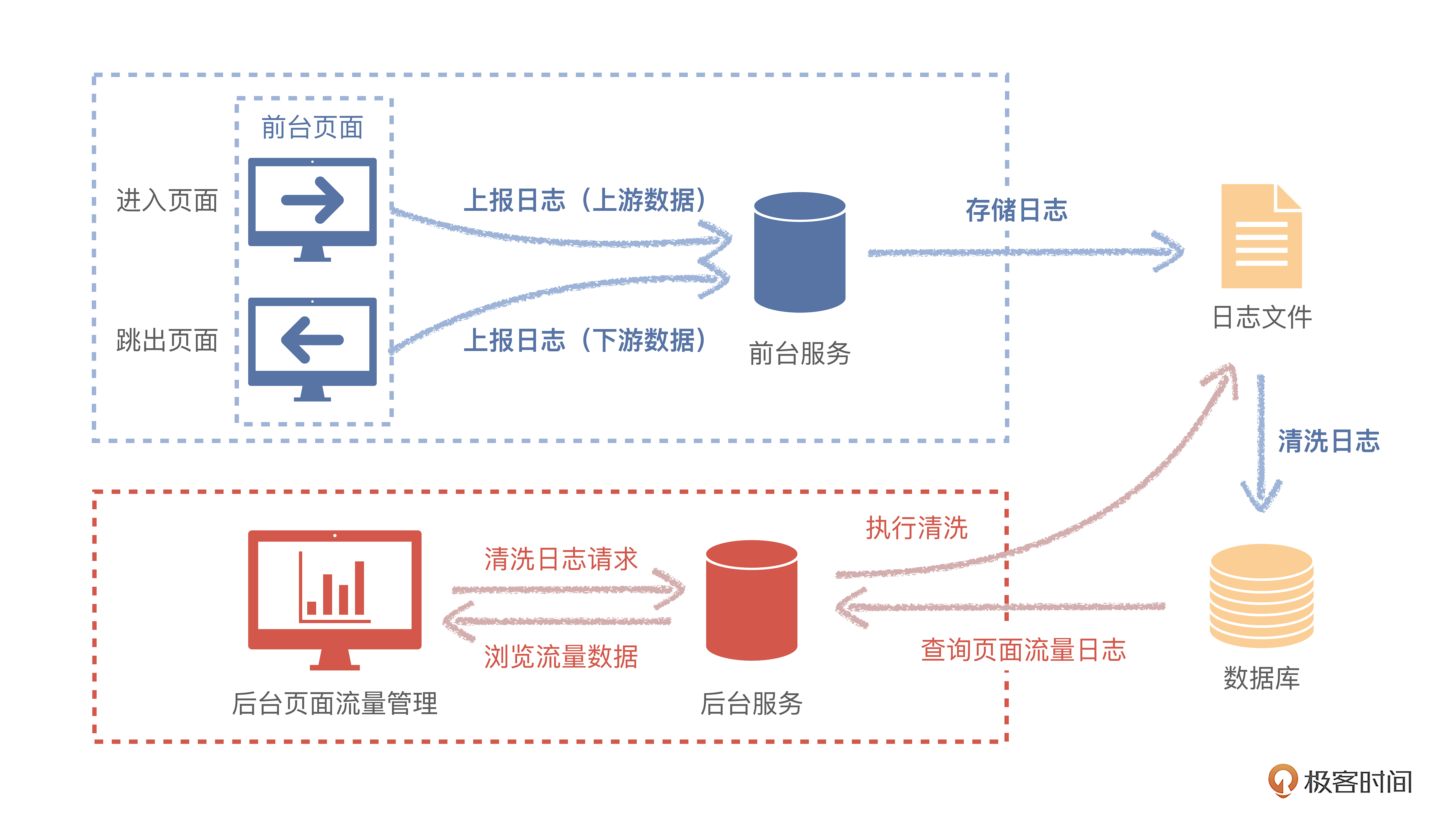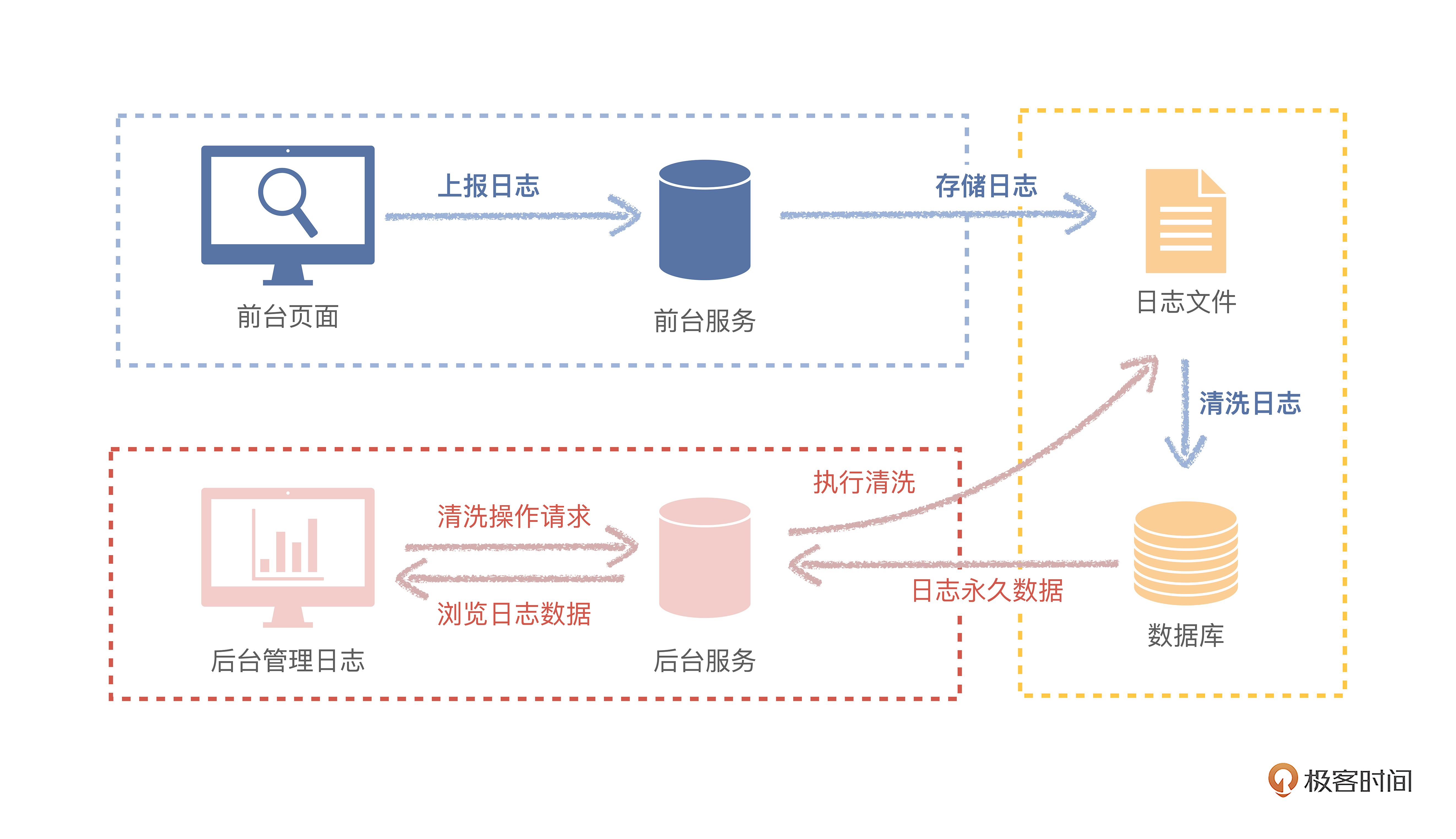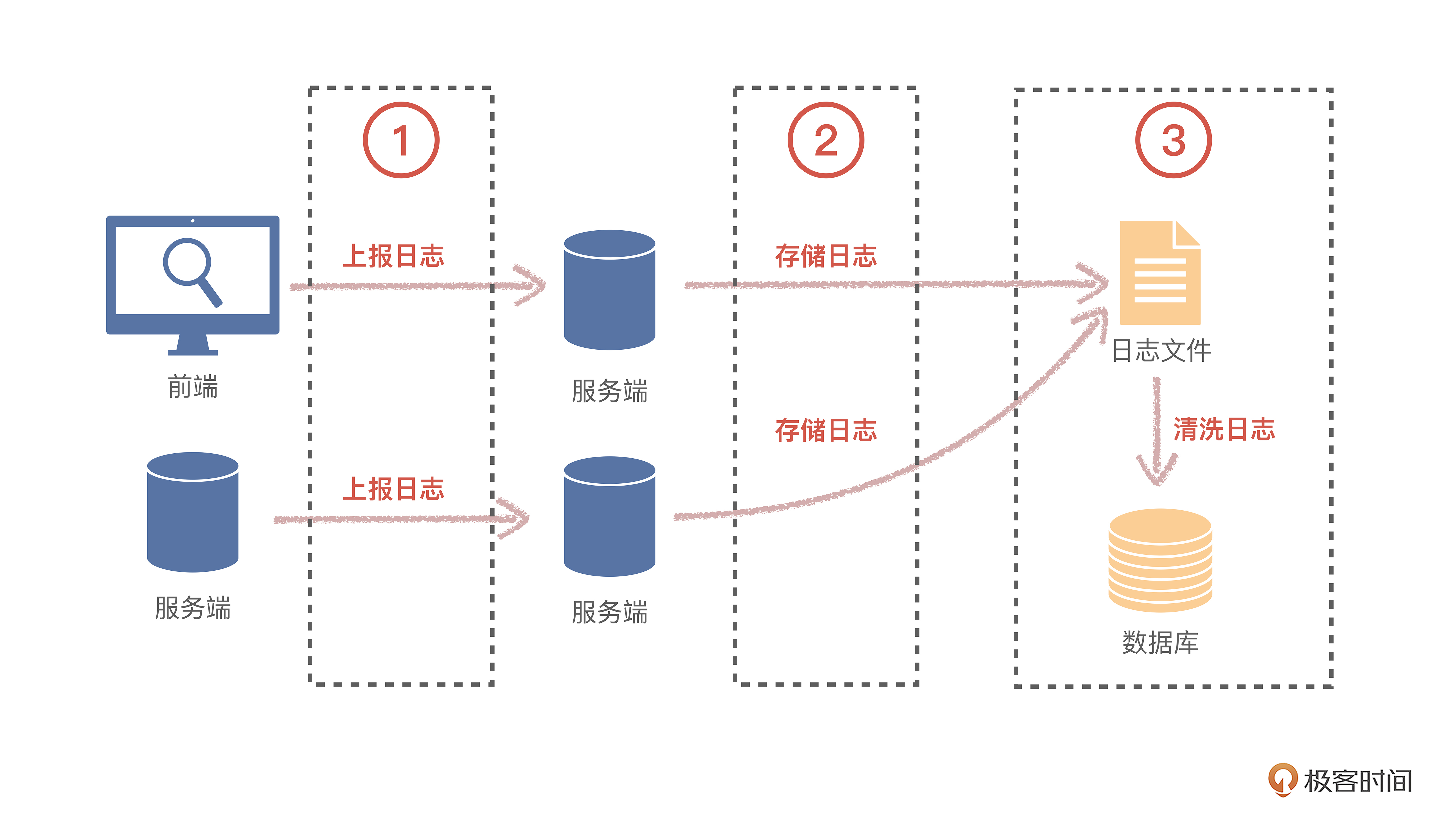 我们的课程案例主要是站在客户视角,围绕“前台页面”实现“监控页面的异常”和“跟踪页面流量”,功能实现也会遵循刚才归纳的日志功能链路,上报、存储和清洗日志。所以,功能实现的第一件事就是要通过上报和存储,收集日志数据,具体如何实现呢?