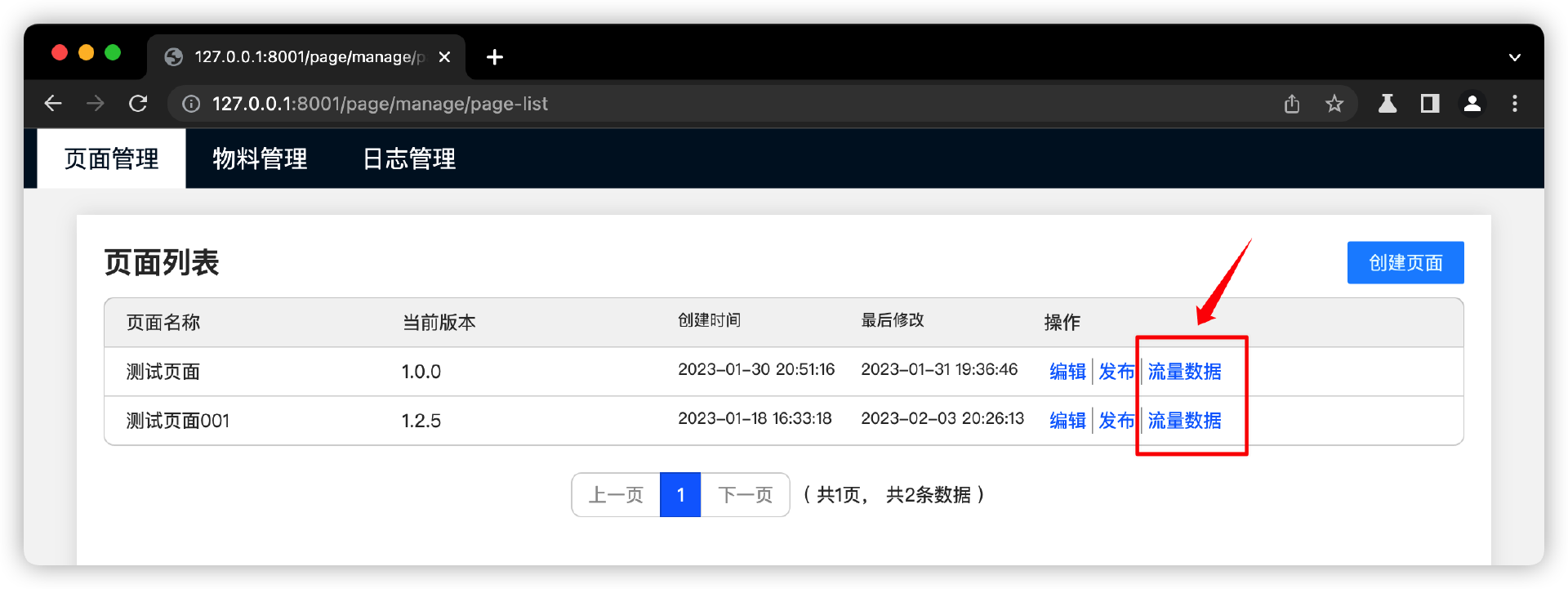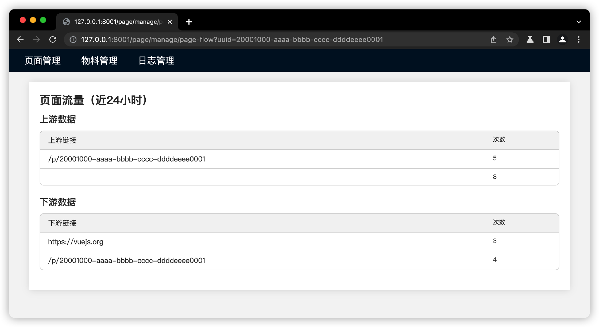 - 第四步,在后台页面管理中,提供根据页面来查询日志上下游流量数据。
