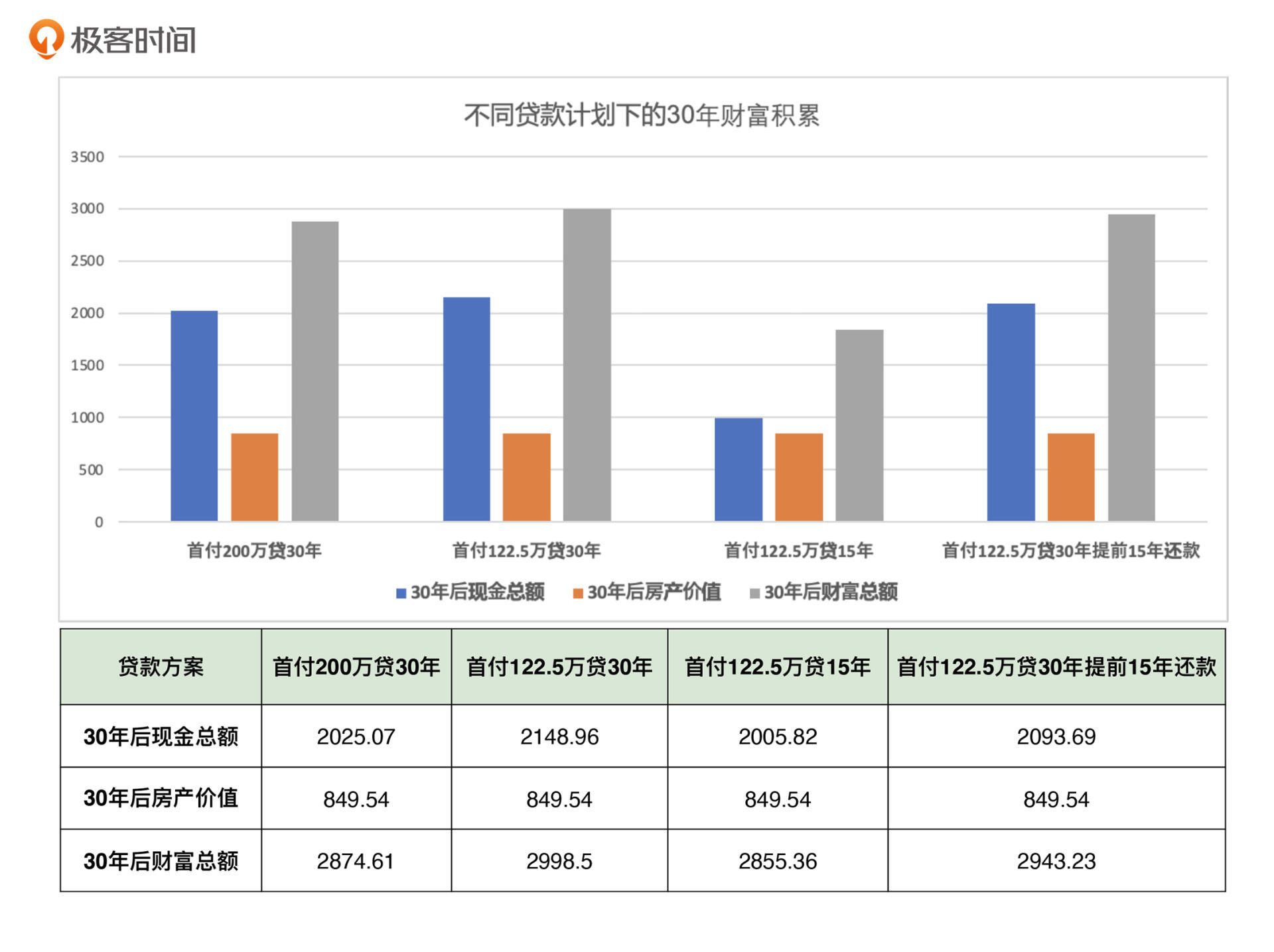 从图中我们看到,同样是贷款30年,如果小Y只交122.5万的首付,留下剩余的77.5万作为理财款,那么在还完贷款的30年后,他的财富总额会是2998.5万;而如果把200万全部作为首付,他的财富总额是2874.6万。低首付方案的财富总额多出了100多万。