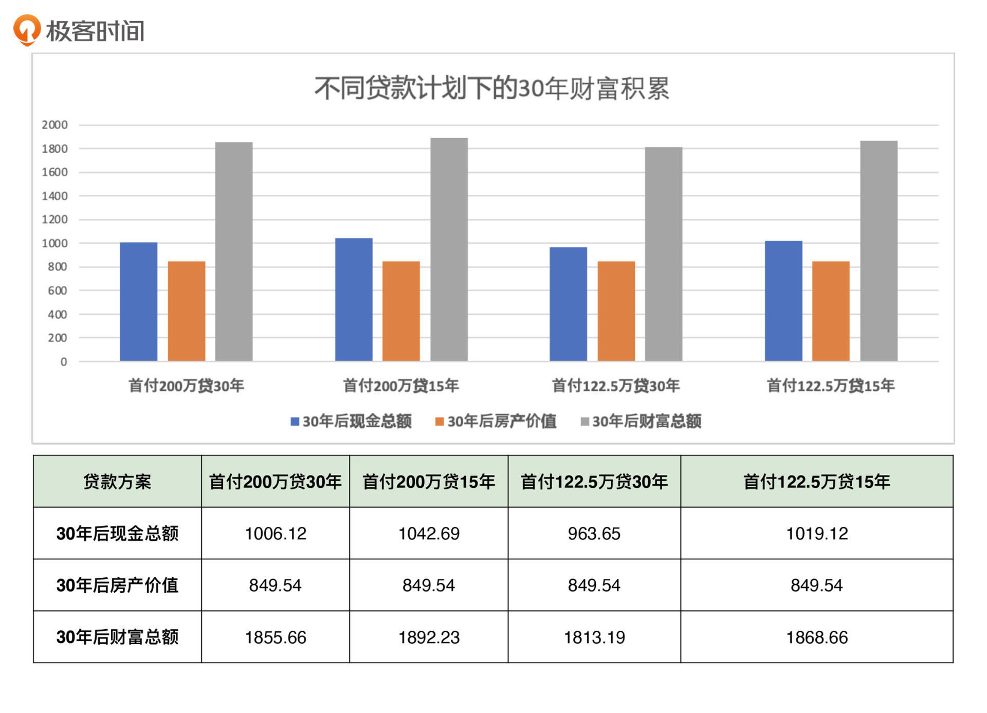 再回到上面的图片,观察第二个和第三个柱状图,你会发现:采用这两种贷款方案,最后得到的结果差异也很大,贷款15年的财富总额足足少了140多万。