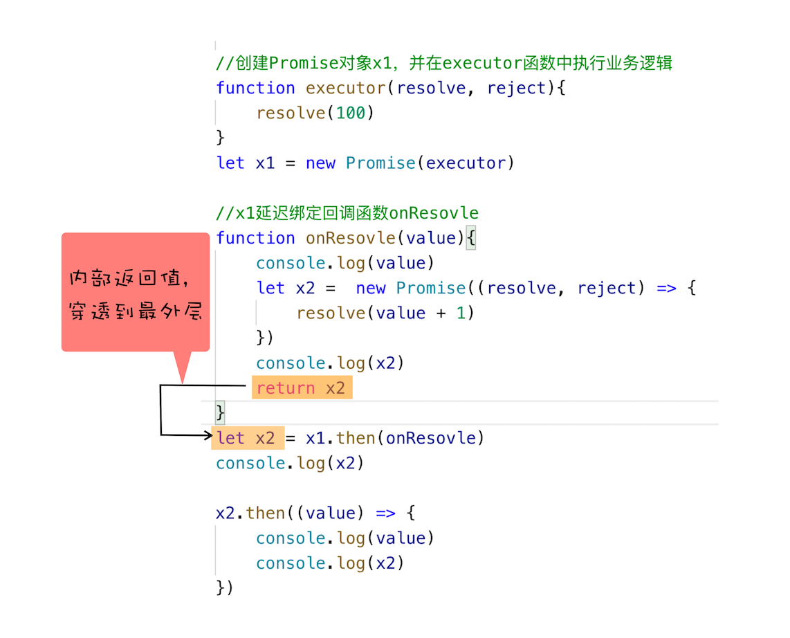 其次,需要将回调函数onResolve的返回值穿透到最外层。因为我们会根据onResolve函数的传入值来决定创建什么类型的Promise任务,创建好的Promise对象需要返回到最外层,这样就可以摆脱嵌套循环了。你可以先看下面的代码: