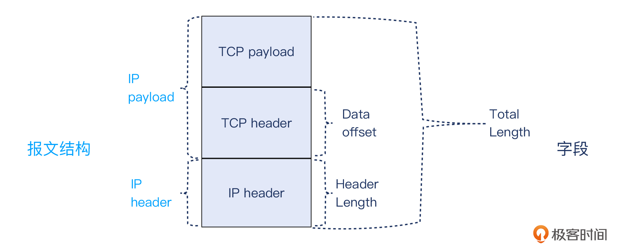 在IP协议里,IP header是用一个Total Length字段,表示了包含IP头部在内的整个IP报文的长度。那怎么区分IP头部和载荷呢?IP头部还有一个字段是Header Length,表示了头部自身的长度。这样两个Length值的差,就是IP载荷的大小了。
