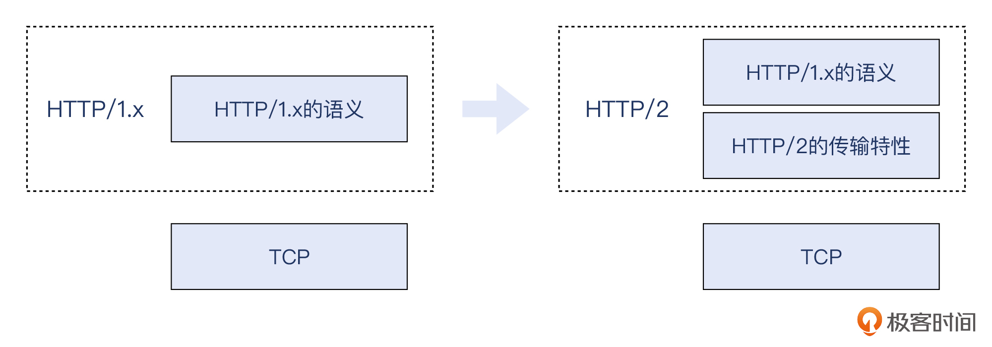 从这一点上看,你甚至可以把HTTP/2理解为是在HTTP/1.x的语义的基础上,增加了一个介于TCP和HTTP之间的新的“传输层”。也就是下图这样: