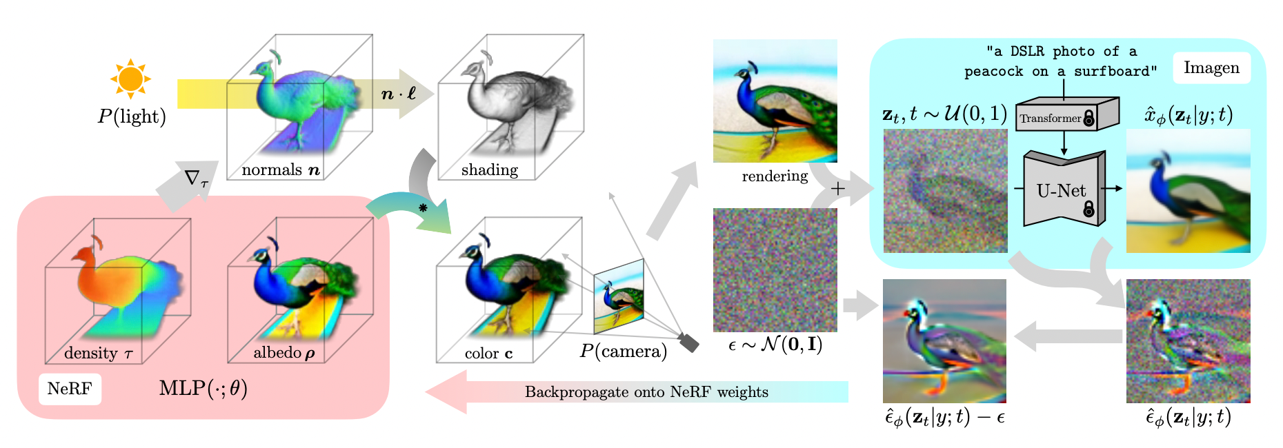 简单来说,NeRF生成的3D模型,经过渲染可以得到2D图像,而方案中的AI绘画模型能够根据prompt生成目标2D图像。这样我们就可以用AI绘画生成的图像和NeRF渲染后得到的图像计算损失函数,从而优化NeRF模型的参数。