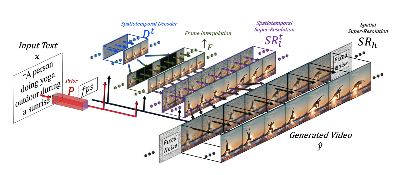 你可以点开后面的图像,进一步了解Make-A-Video实现文生视频的过程。首先输入一个prompt,先验模型P根据prompt生成16个图像表征。然后解码器模型对图像表征进行解码,得到16张64x64分辨率的图像。之后经过视频插帧模块、连续两个上采样模块$SR_{l}$和$SR_{h}$,最终得到一段高分辨率的视频。