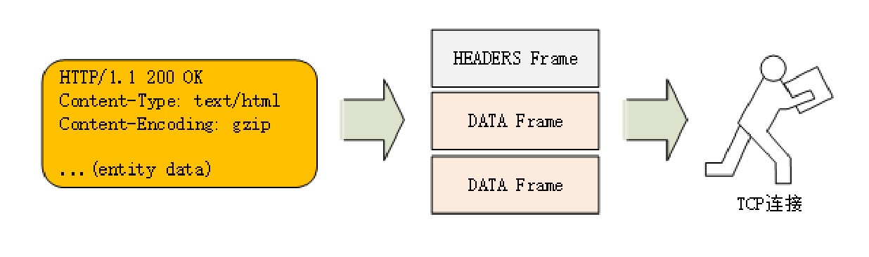 它把TCP协议的部分特性挪到了应用层,把原来的“Header+Body”的消息“打散”为数个小片的二进制“帧”(Frame),用“HEADERS”帧存放头数据、“DATA”帧存放实体数据。