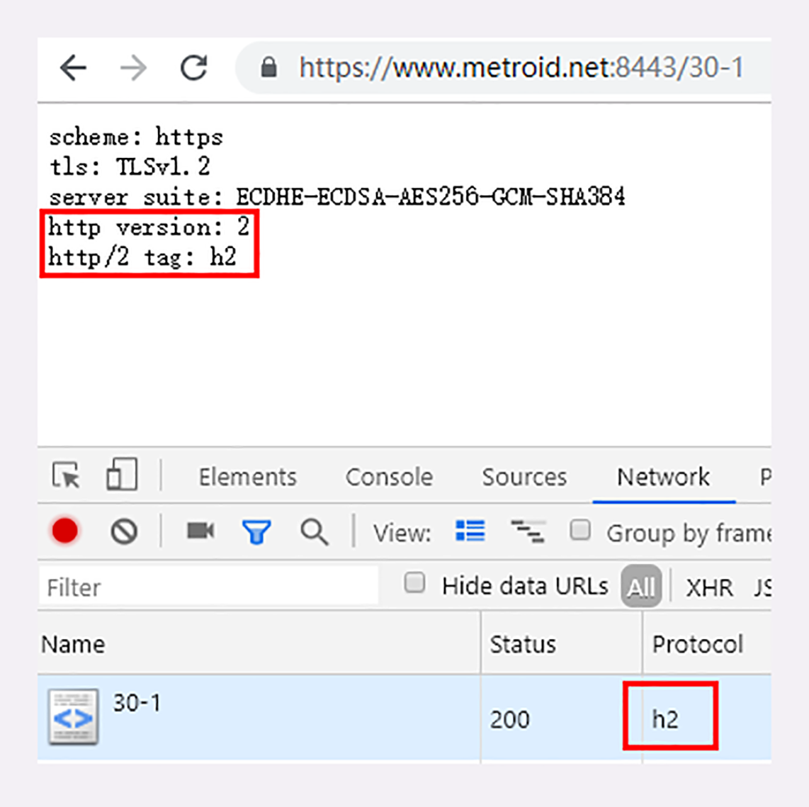 在今天这节课专用的URI“/30-1”里,你还可以看到服务器输出了HTTP的版本号“2”和标识符“h2”,表示这是加密的HTTP/2,如果改用“https://www.chrono.com/30-1”访问就会是“1.1”和空。