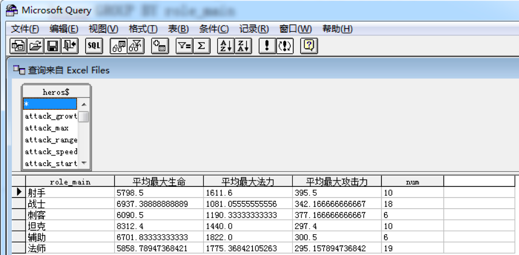 1 | SELECT role_main, avg(hp_max) AS `平均最大生命`, avg(mp_max) AS `平均最大法力`, avg(attack_max) AS `平均最大攻击力`, count(*) AS num FROM [heros$] GROUP BY role_main |
