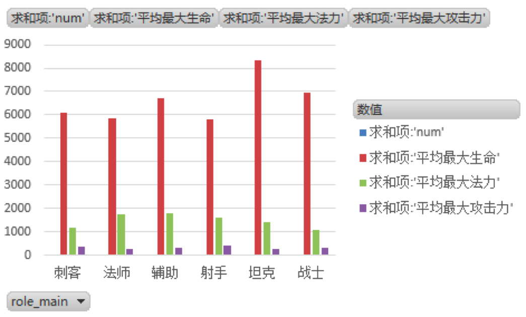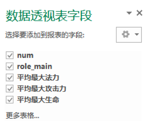 然后我们在右侧面板中选择“数据透视表字段”,以便对数据透视表中的字段进行管理,比如我们勾选num,role_main,平均最大生命,平均最大法力,平均最大攻击力。
