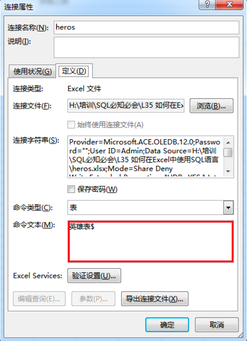 第三步,通过“属性” → “定义”中的命令文本来使用SQL查询,选择我们想要的数据,也可以将整张表直接导入到指定的位置。