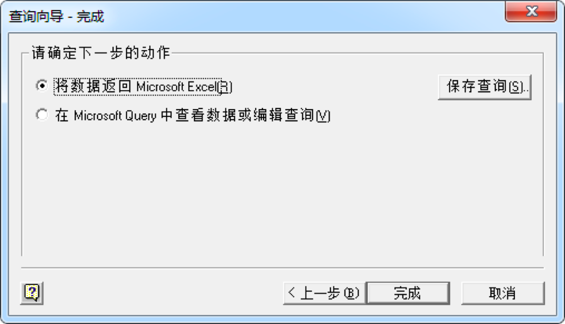 最后我们可以选择“将数据返回Microsoft Excel”还是“在Microsoft Query中查看数据或编辑查询”。这里我们选择第一个选项。