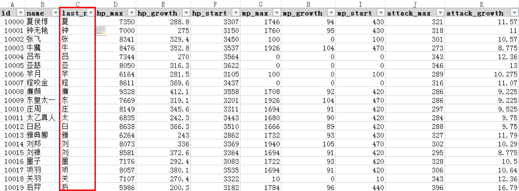 需要说明的是,有时候自动填充功能并不完全准确,我们还需要对某些数据行的last_name进行修改,比如“夏侯惇”的姓氏应该改成“夏侯”,“百里守约”改成“百里”等。