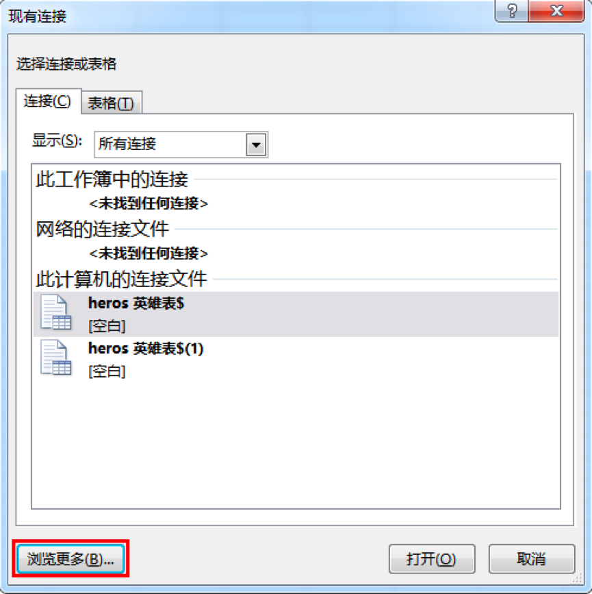 第一步,选择指定的文件。方法是通过“数据” → “现有连接”按钮选择连接。这里选择“浏览更多”,然后选择指定的xls文件。