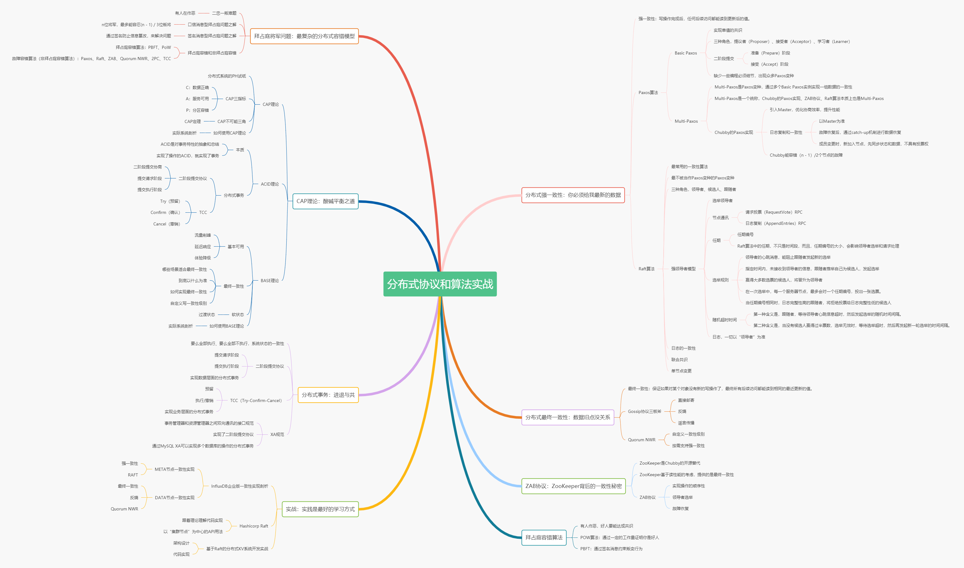 我啰嗦了那么多,其实就是为了让你更高效地掌握常用的分布式算法。另外,为了帮你更好的理解算法的特点和整体学习的思路,我做了个知识地图,方便你梳理整个知识体系。