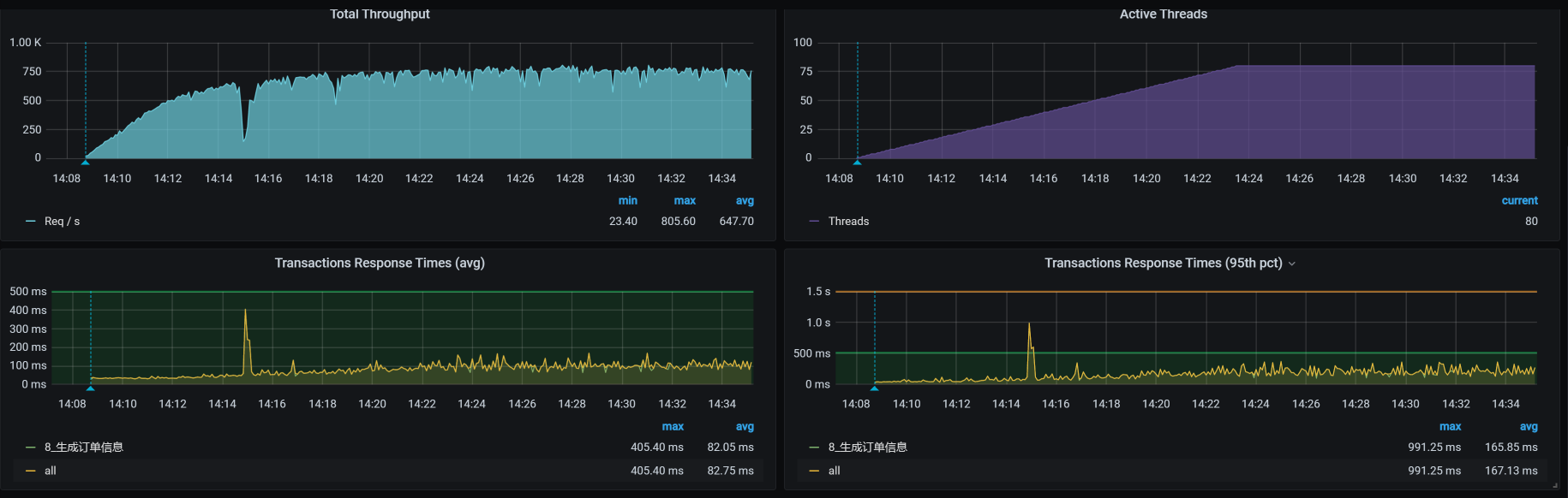那为什么我们之前修改Order服务的Tomcat线程数没有看到效果呢?这是因为压力已经到了Member服务上,这让Member服务所在的worker节点资源使用率增加,导致Member服务无法正常响应请求。因此,整个TPS看起来没有什么优化效果。现在,我们移走了Member服务,看到效果明显增加,这说明我们的方向还在正确的道路上。