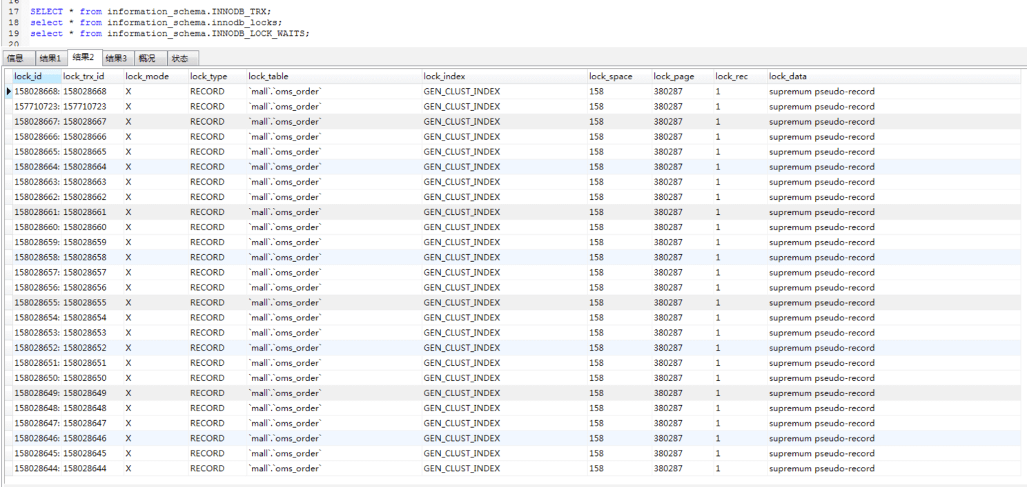 不难看出,lock_mode这一列的值全是X,意思是X锁。我们知道,排他锁(X锁),又叫写锁。图中的锁类型(lock_type)全是RECORD,锁住的是索引,并且索引是GEN_CLUST_INDEX,说明这个锁等待是因为innodb创建的隐藏的聚集索引。
