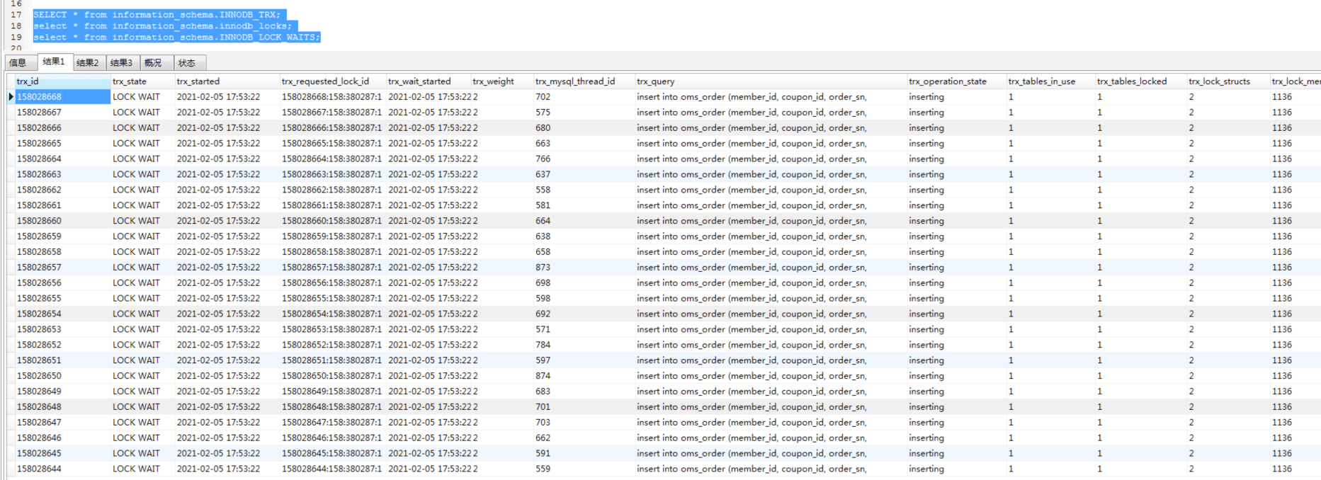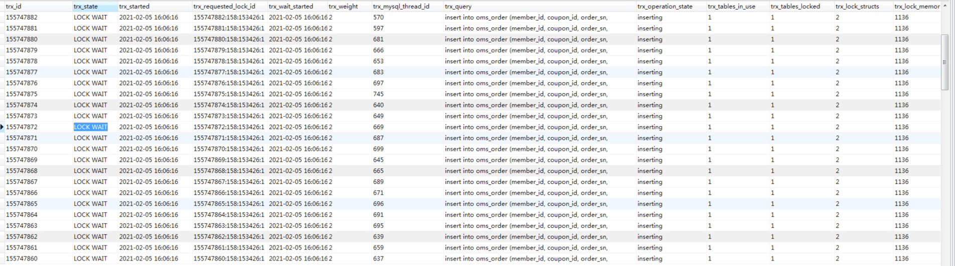 显然当前的锁有点多,并且这锁的时间还挺长。要想查锁,就得先知道当前正在运行的是什么样的事务,所以我们就去查一下innodb_trx表,因为MySQL在这个表中会记录所有正在执行的事务。在数据库中,我们发现了大量的lock_wait(锁等待):