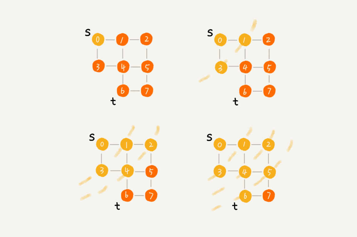 你可以看我画的这幅图。搜索的起始顶点是s,终止顶点是t,我们希望在图中寻找一条从顶点s到顶点t的路径。如果映射到迷宫那个例子,s就是你起始所在的位置,t就是出口。