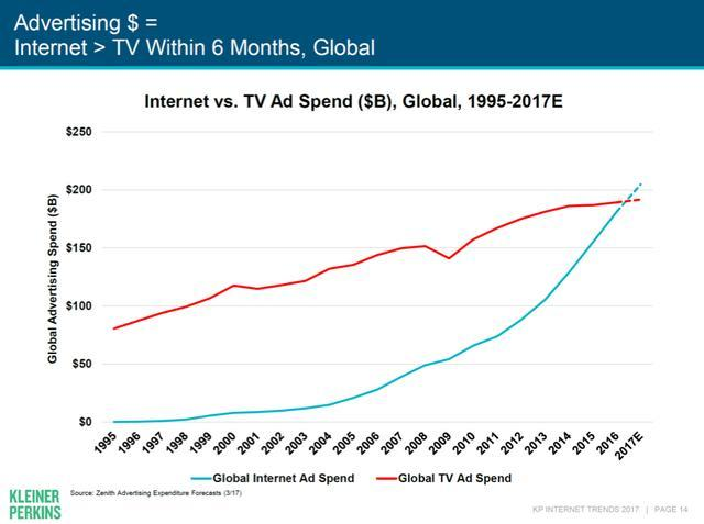 被称为“互联网女皇”的美国著名投资家和分析师玛丽·米克尔(Mary Meeker),每年都会发布一篇数百页的互联网趋势报告。我们通过追溯以往的报告数据发现:广告市场在2018年迎来了一个大拐点——在全球范围内,互联网广告的规模首次超过了电视广告。