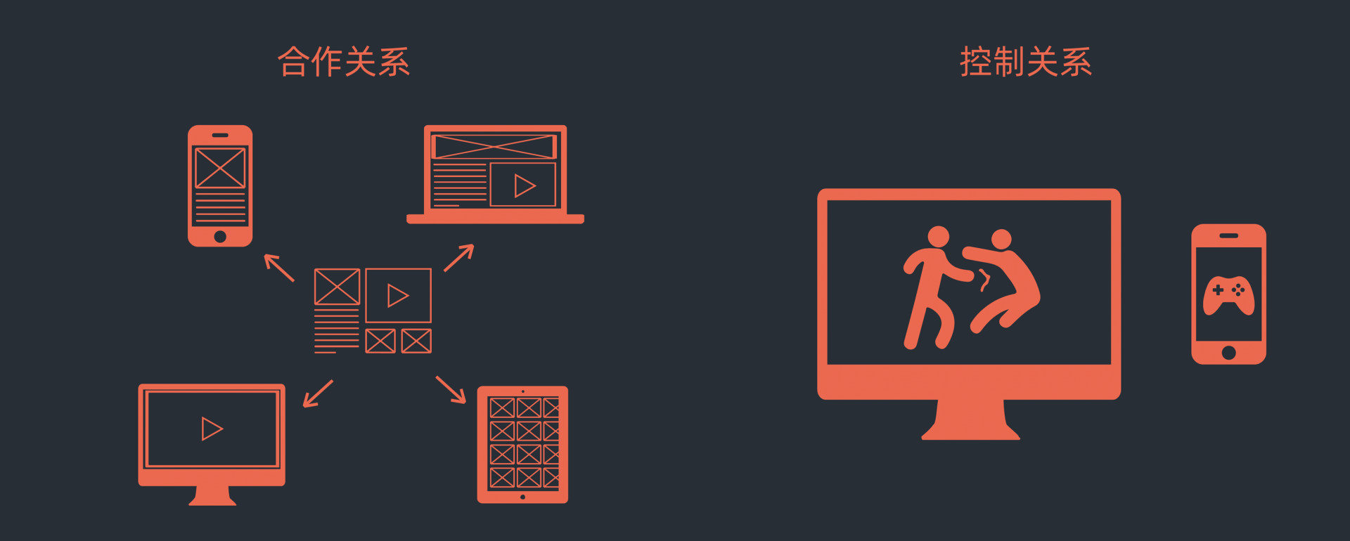 互补性交互中,多个设备的关系一般分为两种:一种是合作关系,同一时刻两者有不同内容和不同侧重,互为补充;一种是两个设备之间有明显的主控关系,例如设备1给设备2提供输入,或者设备1控制设备2。