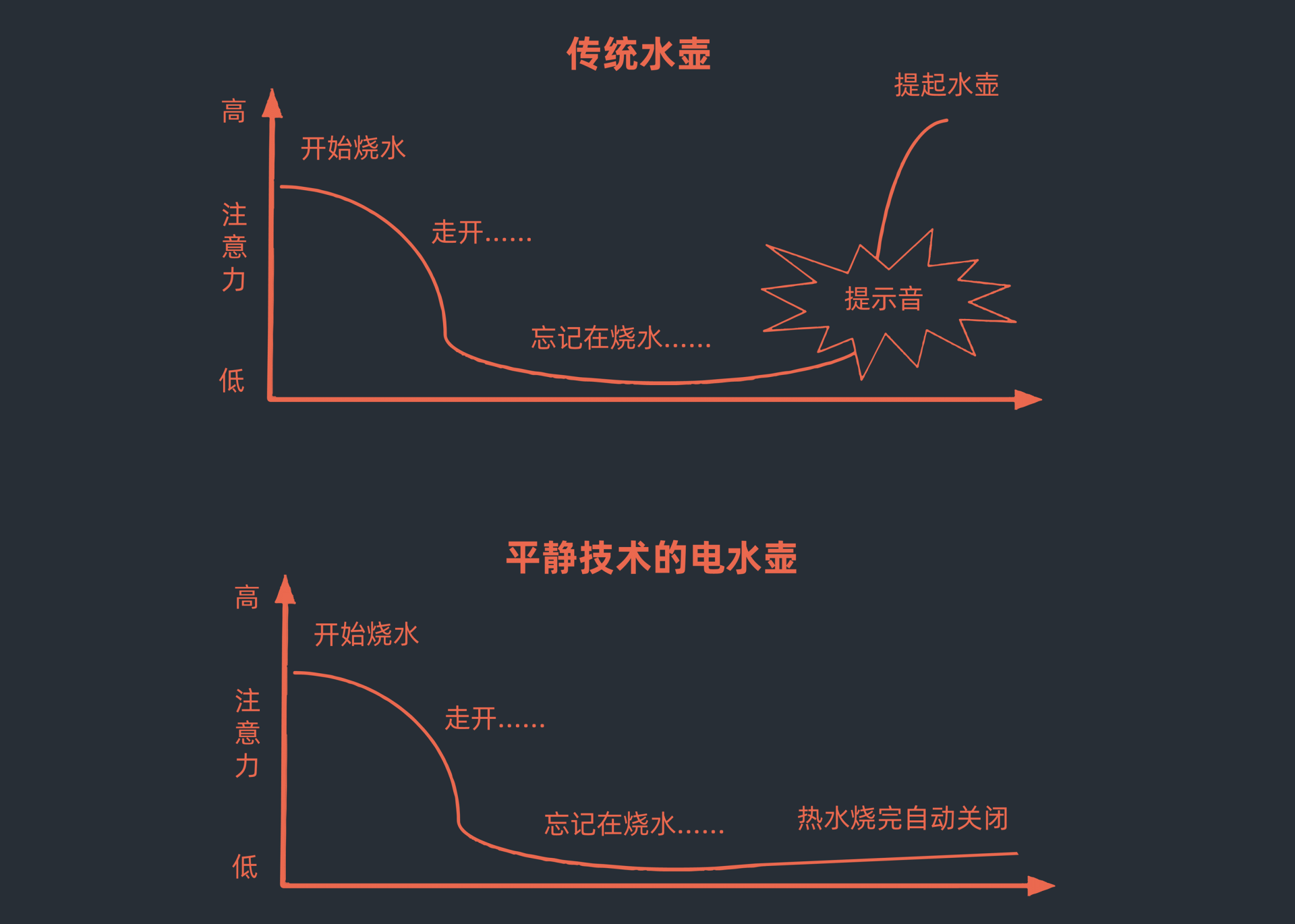 我举个例子,就如以前的传统水壶烧热水,会有鸣笛声响起,让你从客厅急速地跑到厨房关火提起水壶。但是现在的电水壶只要开始烧水,你就完全不用管它了,甚至再往后它可以做到自动帮你沏茶,帮你把茶端到你面前。