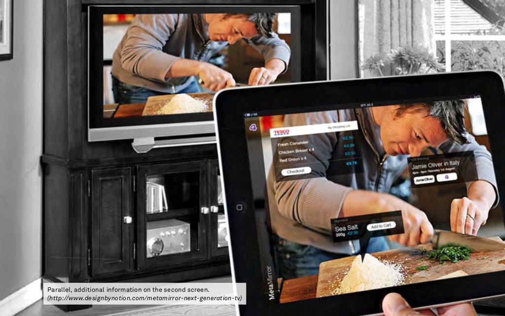 再比如电视屏幕适合沉浸式内容欣赏,而手持移动设备更适合交互式体验。在下图中电视上一个普通的做菜视频,在平板上播放的时候就会直接给出对应材料的附属说明信息和购买链接,用户可以直接触屏采购这道菜的所有原材料。