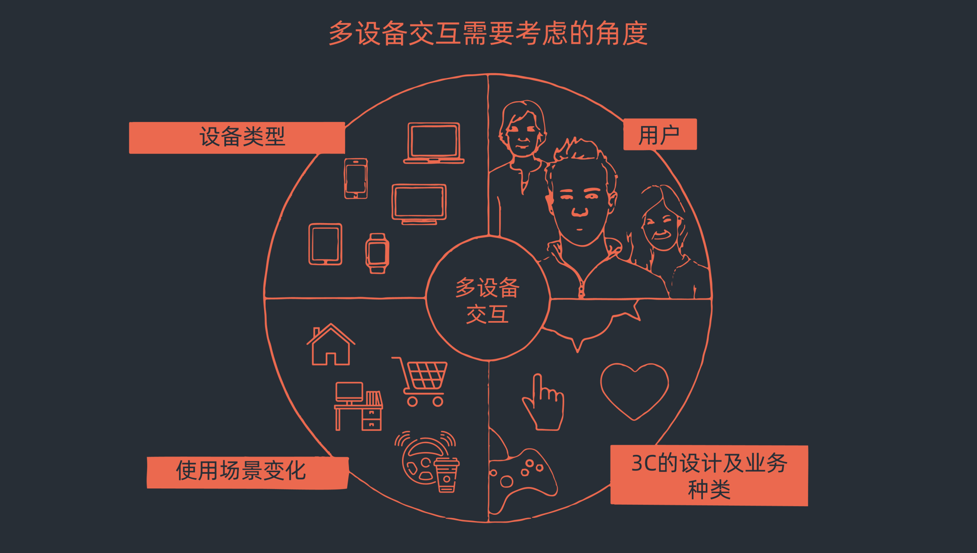 那如何进行多设备的交互设计呢?这里面的复杂度远远超过单设备的情况。你至少要从四个维度去思考,分别是用户、设备类型、使用场景变化以及3C的设计及业务种类。