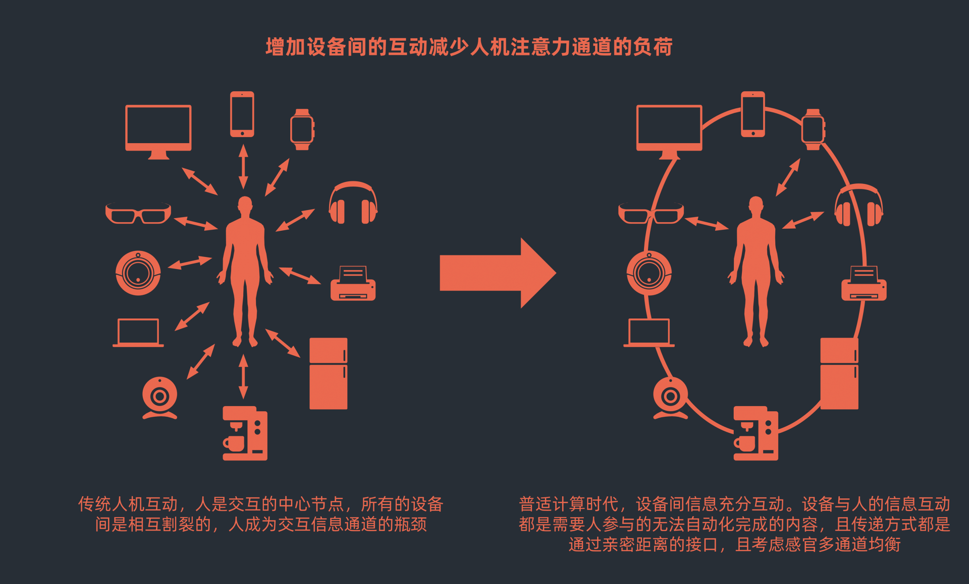 在这种背景下我们不仅得注意单人和设备的互动,还要增加大量的设备与设备的互动,以避免人在中间成为信息转换的瓶颈。