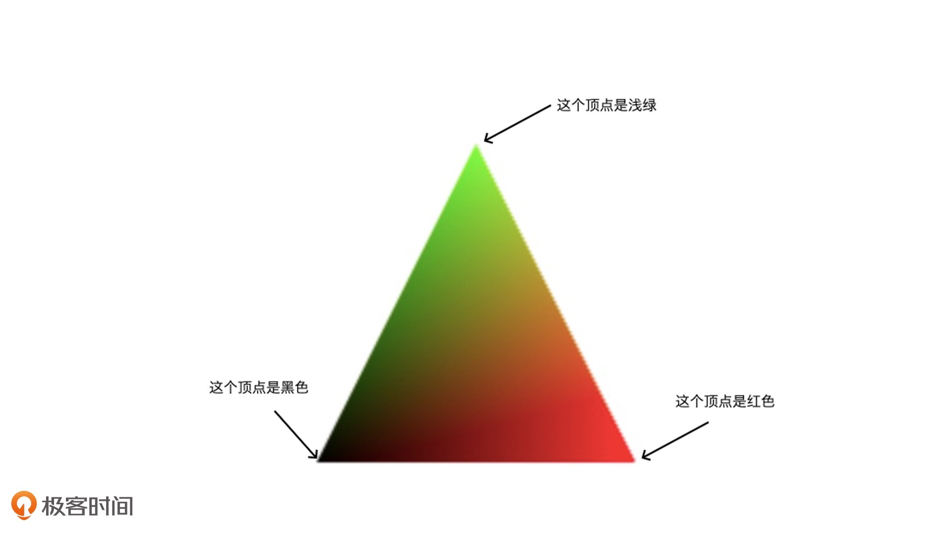 这样一来,顶点[-1,-1]被映射为[0,0,0]也就是黑色,顶点[0,1]被映射为[0.5, 1, 0]也就是浅绿色,顶点[1,-1]被映射为[1,0,0]也就是红色。这样一来,三个顶点就会有三个不同的颜色值。