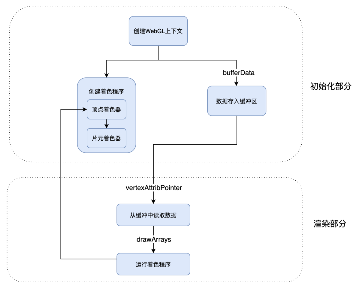 一般来说,在WebGL中要完成图形的绘制,需要创建WebGL程序,然后将图形的几何数据存入数据缓冲区,在绘制过程中让WebGL从缓冲区读取数据,并且执行着色器程序。
