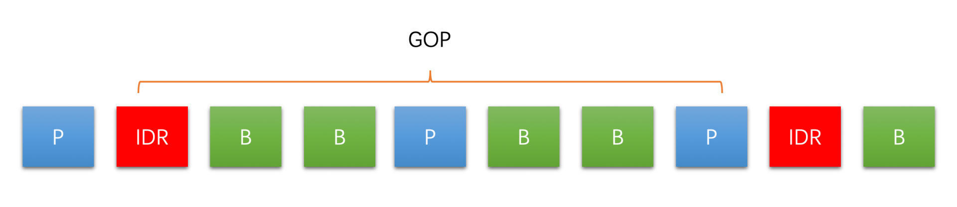 在H264中,还有一个GOP的概念也经常会遇到,它是什么意思呢?从一个IDR帧开始到下一个IDR帧的前一帧为止,这里面包含的IDR帧、普通I帧、P帧和B帧,我们称为一个GOP(图像组)(这是closed GOP,还有一种opened GOP,比较少见,这里不讨论)。