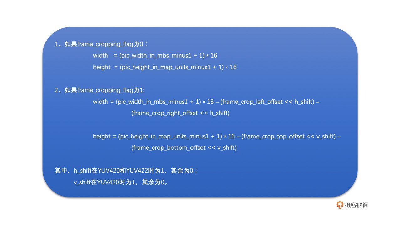 这几个字段都是通过无符号指数哥伦布编码的,需要先解码出来。解码得到具体值之后,通过以下方法就可以得到分辨率了。注意,pic_height_in_map_units_minus1需要考虑帧编码和场编码的区别,其中场编码已经很少使用了,我们这里不再考虑。