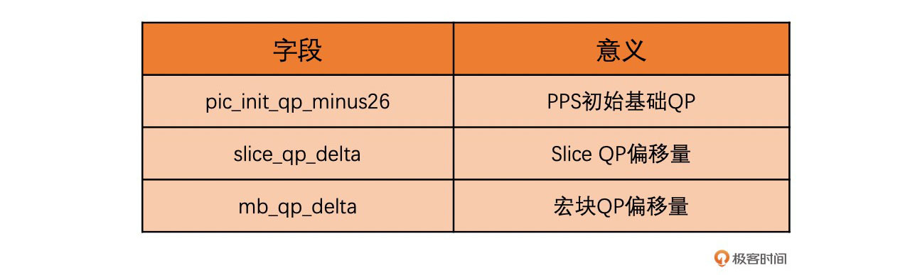 在PPS中有一个全局基础QP,字段是pic_init_qp_minus26。当前序列中所有依赖该PPS的Slice共用这个基础QP,且每一个Slice在这个基础QP的基础上做调整。在Slice Header中有一个slice_qp_delta字段来描述这个调整偏移值。更进一步,H264允许在宏块级别对QP做更进一步的精细化调节。这个字段在宏块数据里面,叫做mb_qp_delta。