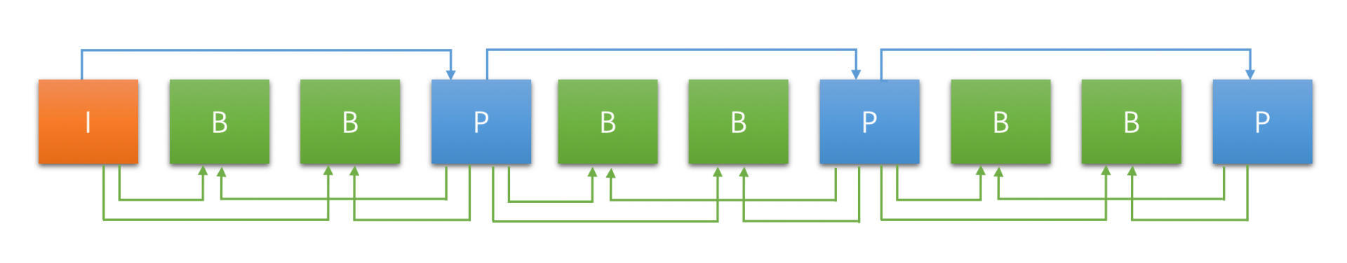 三种帧的示例图如下所示。例如,从左向右,第一个B帧参考第一个I帧和第一个P帧,第一个P帧只参考第一个I帧(箭头是从参考帧指向编码帧)。