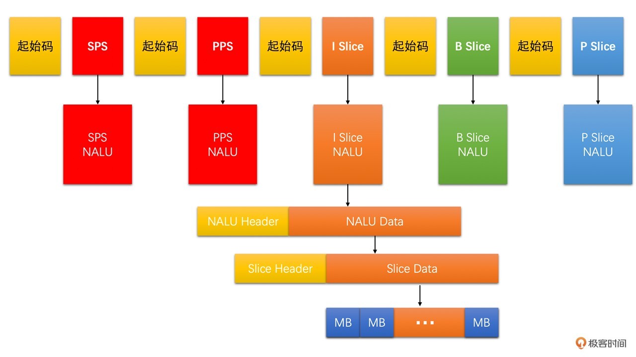 为了解决这个问题,H264设计了NALU(网络抽象层单元)。SPS是一个NALU、PPS是一个NALU、每一个Slice也是一个NALU。每一个NALU又都是由一个1字节的NALU Header和若干字节的NALU Data组成的。而对于每一个Slice NALU,其NALU Data又是由Slice Header和Slice Data组成,并且Slice Data又是由一个个MB Data组成。其结构如下: