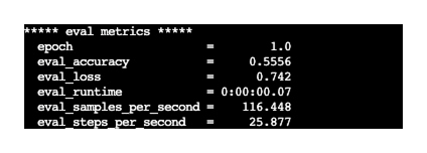 最终训练完成会给出结果数据,这个结果实际上是拿test数据集来做的评估,重点关注 eval_acc 字段的结果,表示预测的准确率。