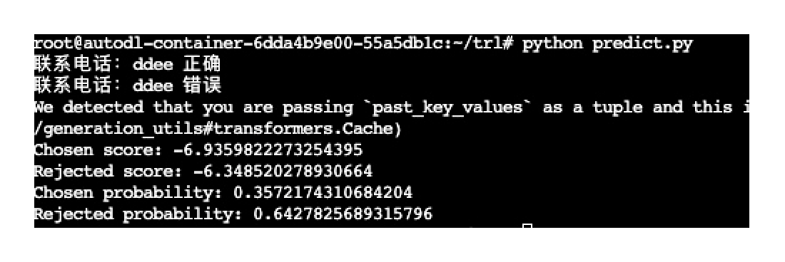 这个预测程序的核心思想是对同一条数据分别做chosen 和 rejected两个预测,看哪个概率大,如果chosen概率大则表示数据正确,如果rejected概率大,则表示错误。我用一个实际运行的截图来说明。