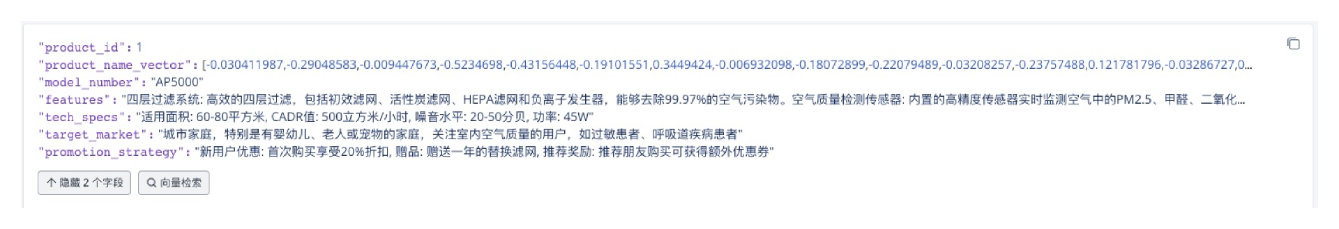 下面是这个数据存储到向量数据库的显示,只有产品名称字段是向量表示。