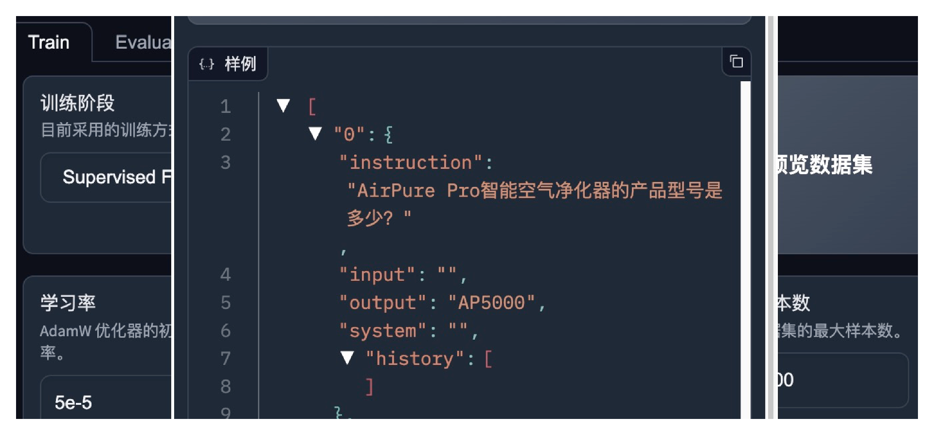 从数据集中选择出我们刚才准备的数据集,查看数据,确保数据准确无误即可。其他微调参数不用改。