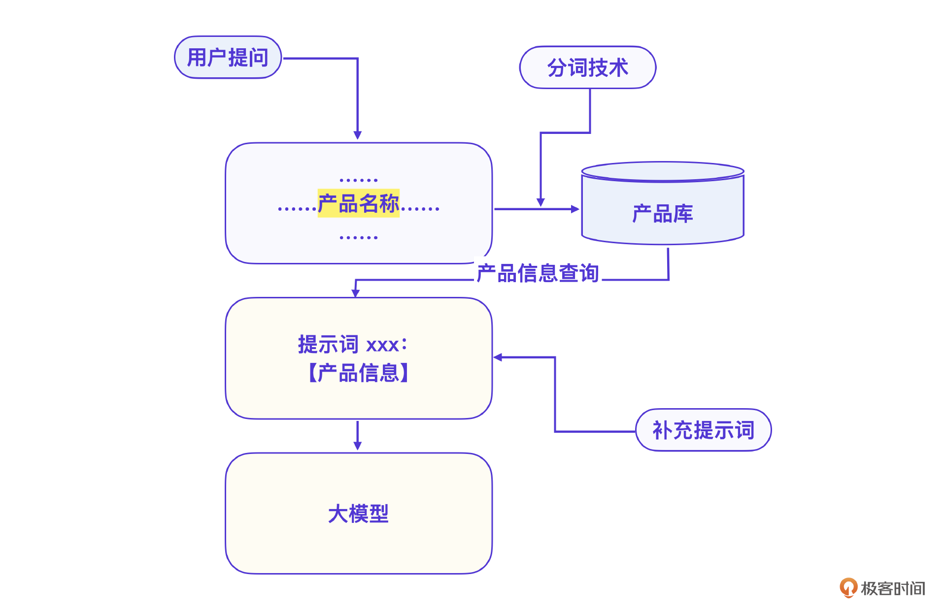 根据用户的提问要求提取出产品名称。 借助产品名称向量查询产品库,找到对应信息。 将产品信息补充到提示词中。