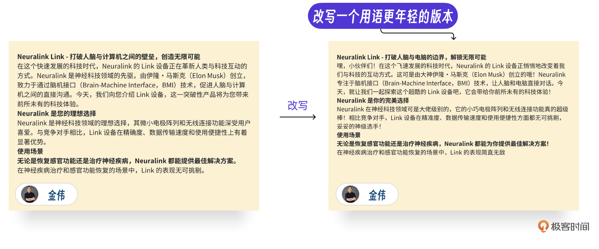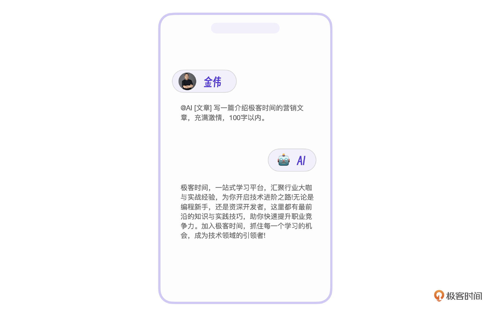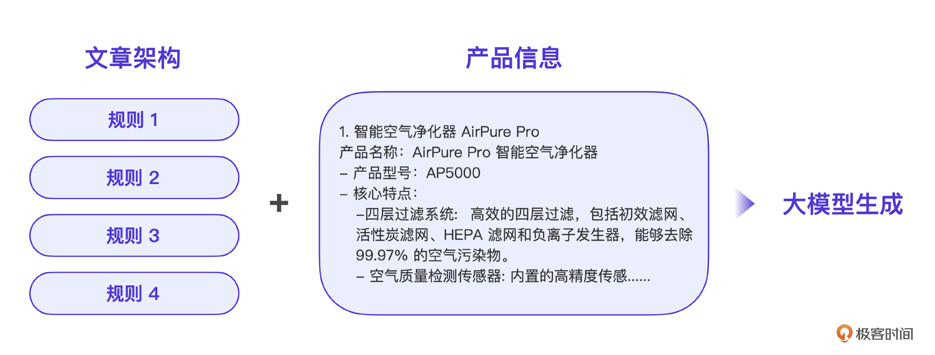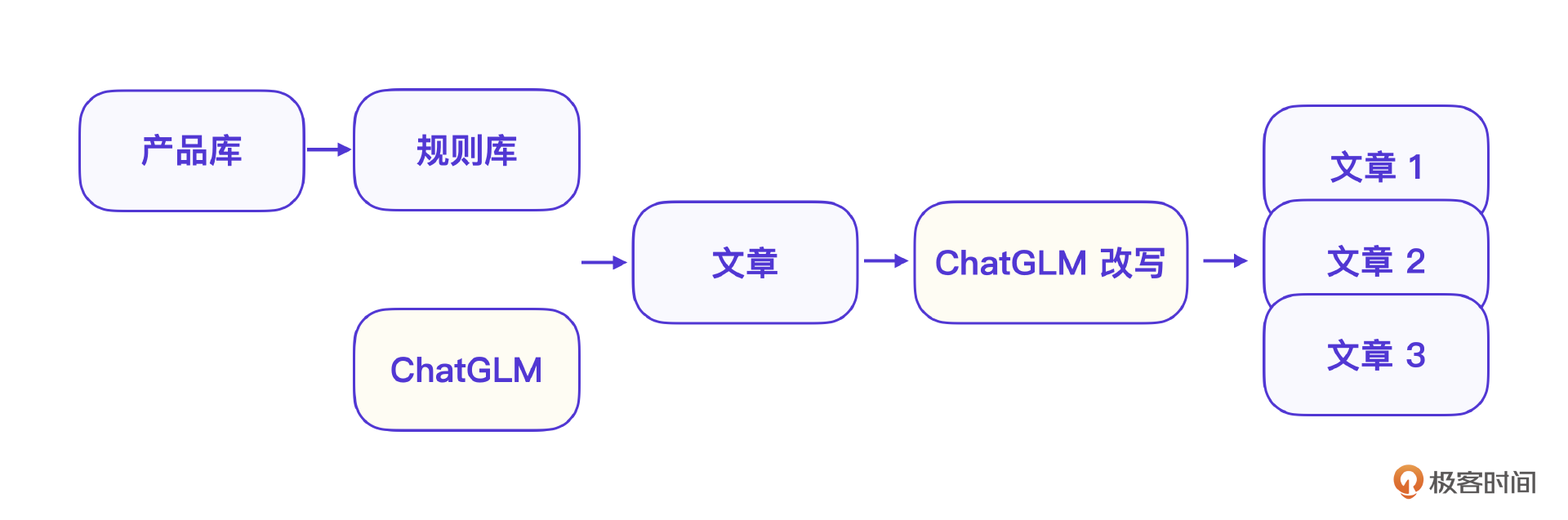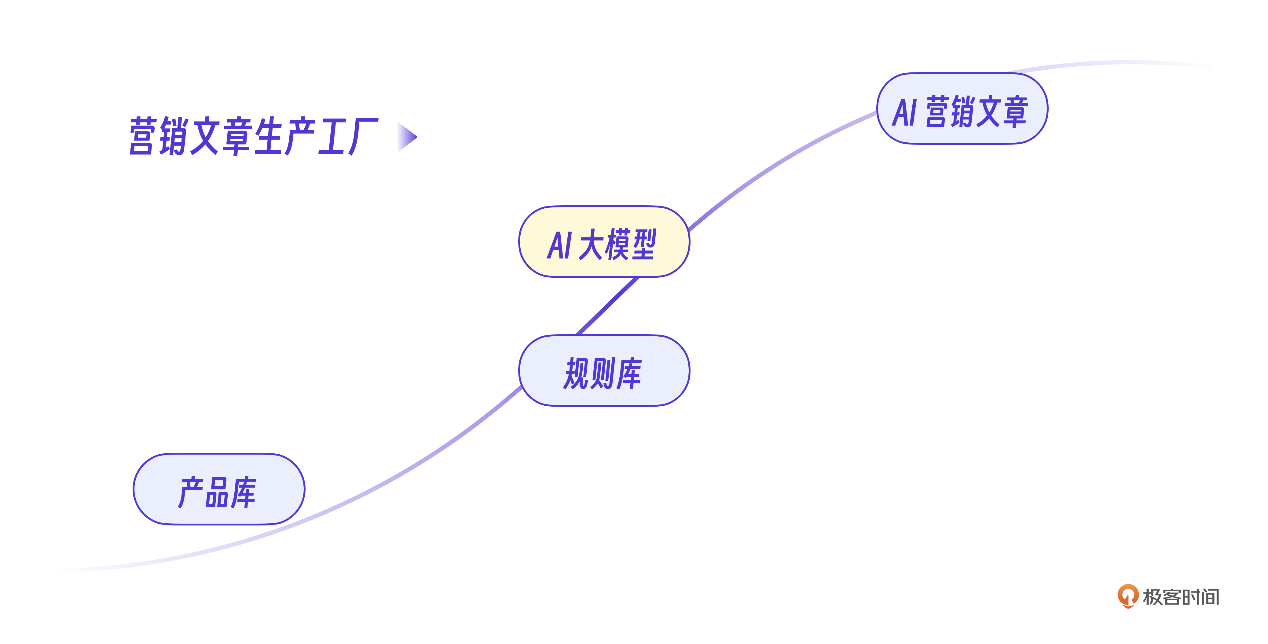 营销文章AIGC 先说营销文章功能,他其实是整个AI营销系统的核心功能。下面有一张示意图,是我让AI写了一篇介绍极客时间的营销文章。产品的界面看起来很简单,不过呢,后端的实现其实总共经历了3个阶段,微调+信息储备,增加规则引擎以及GPT改写。