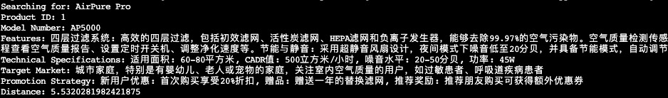 OK, 可以看到下面结果中,这个查询已经把整个产品信息用向量的方式查询出来了,特别注意最后一个输出 Distance 表示这次查询的输入向量和结果向量的相似度,数字越小表示越相似。