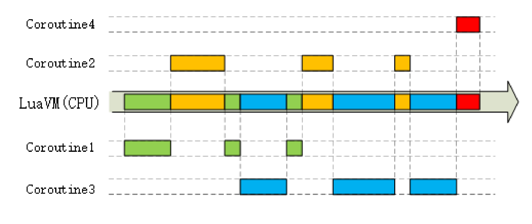 OpenResty里每一段Lua程序都由协程来调度运行。和Linux的epoll一样,每当可能发生阻塞的时候“协程”就会立刻切换出去,执行其他的程序。这样单个处理流程是“阻塞”的,但整个OpenResty却是“非阻塞的”,多个程序都“复用”在一个Lua虚拟机里运行。