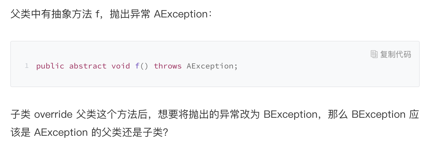 正确答案为,BException是AException的子类。因为只有异常是子类,使用父类的地方catch异常的时候,才能catch到子类异常,也就是才满足里氏替换原则,能用子类替换父类。