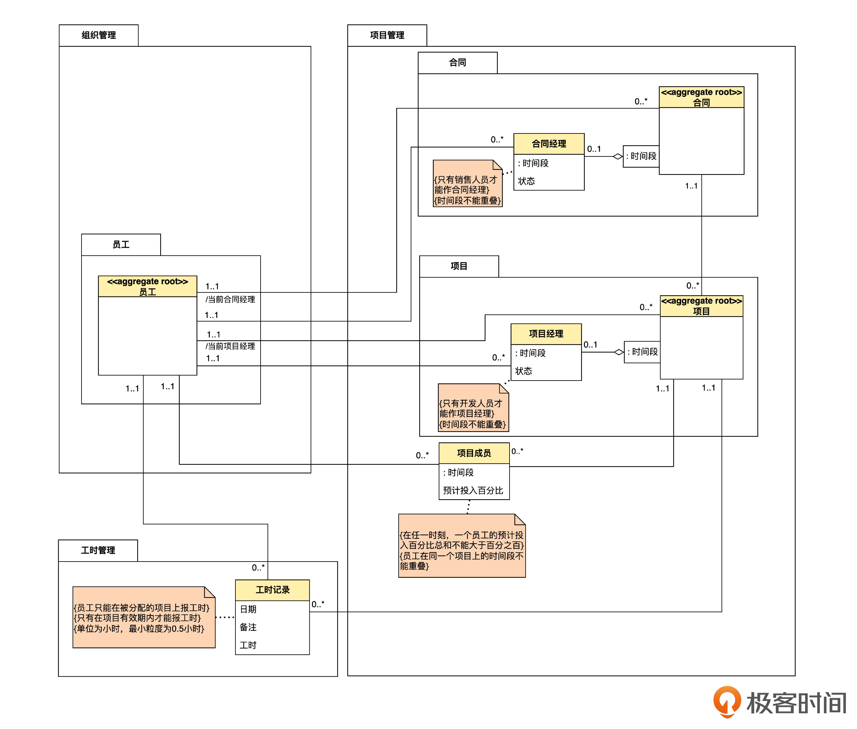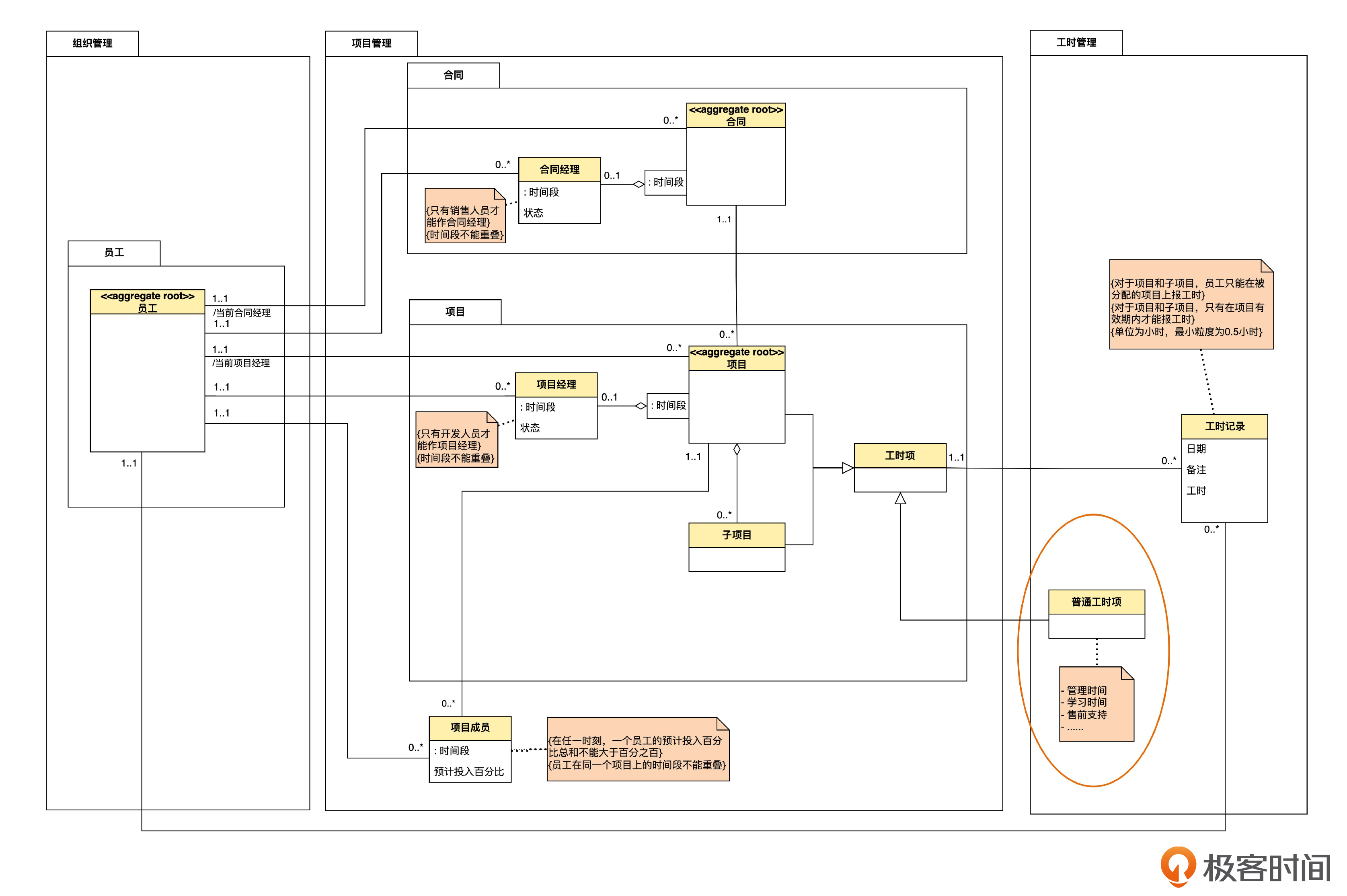 其次,工时项一端的多重性变回了“1..1”,这也就表达了前面说的一条工时记录必须关联且仅关联一个工时项这一业务规则。