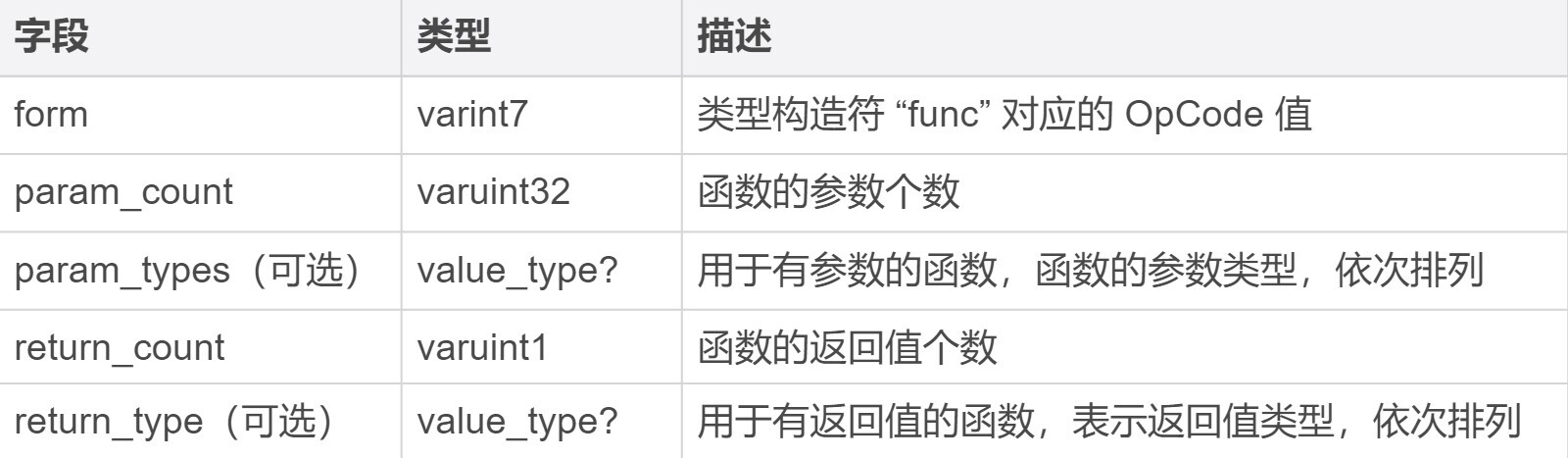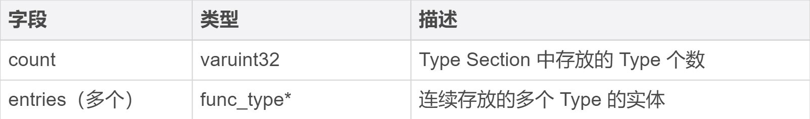 对于 Type Section 来说,它的专有 ID 是 1。紧接着排在“头部”后面的便是这个 Section 相关的有效载荷信息(payload_data)。注意,每个不同类型的 Section 其有效载荷的结构都不相同。比如,Type Section 的有效载荷部分组成如下表所示。